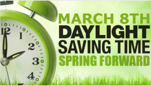 At 2AM on Sunday, March 8th remember to turn your clocks forward 1-hour for Daylight Saving Time.